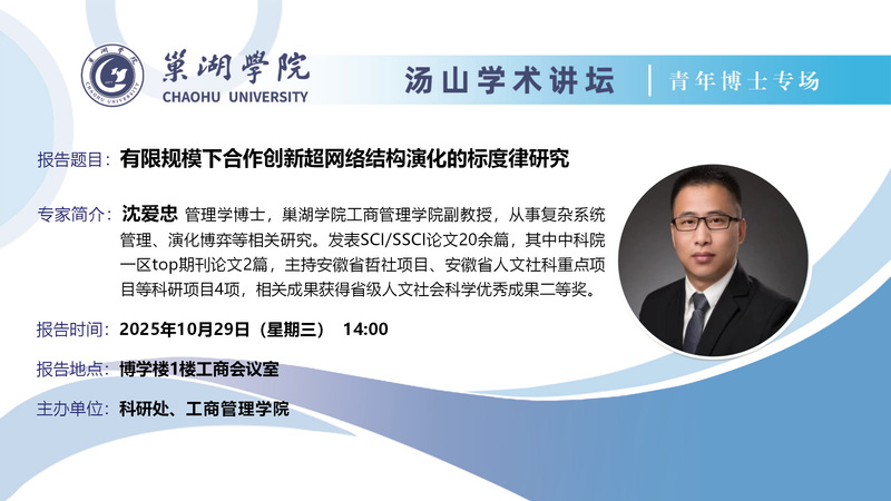 • 湯山學術講壇青年博士專場第24講:(10月29日:工商管理學院沈愛忠博士講座)